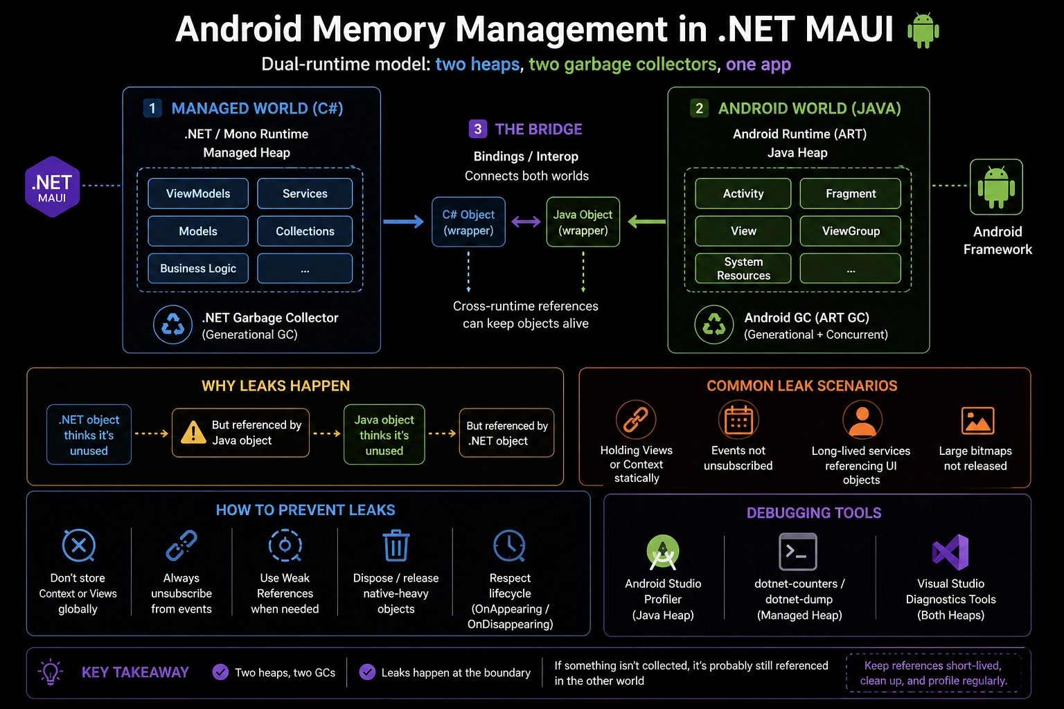 - 👼 Junior: Android .NET apps have two GCs — the .NET GC and Android's ART GC. JNI global references to Java peer objects are capped at 51,200 — creating thousands of MAUI controls rapidly without disposing them can crash the app with a reference table overflow.